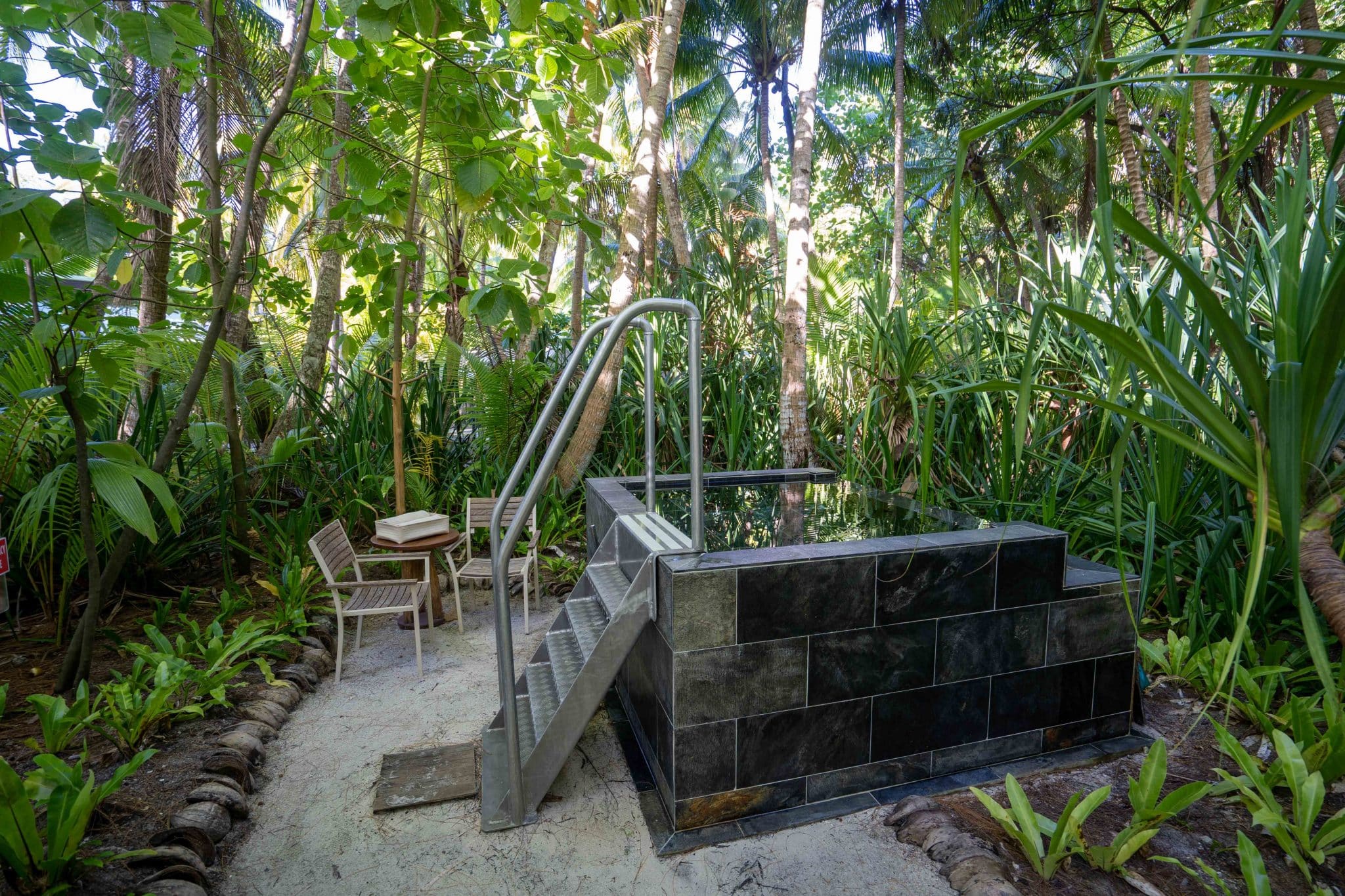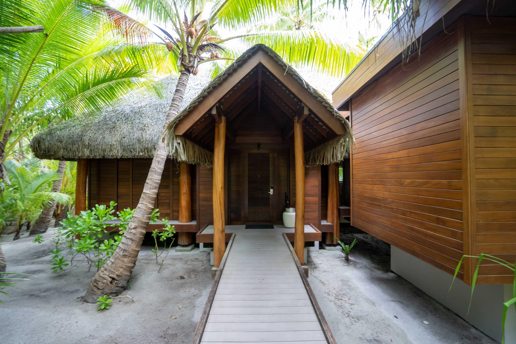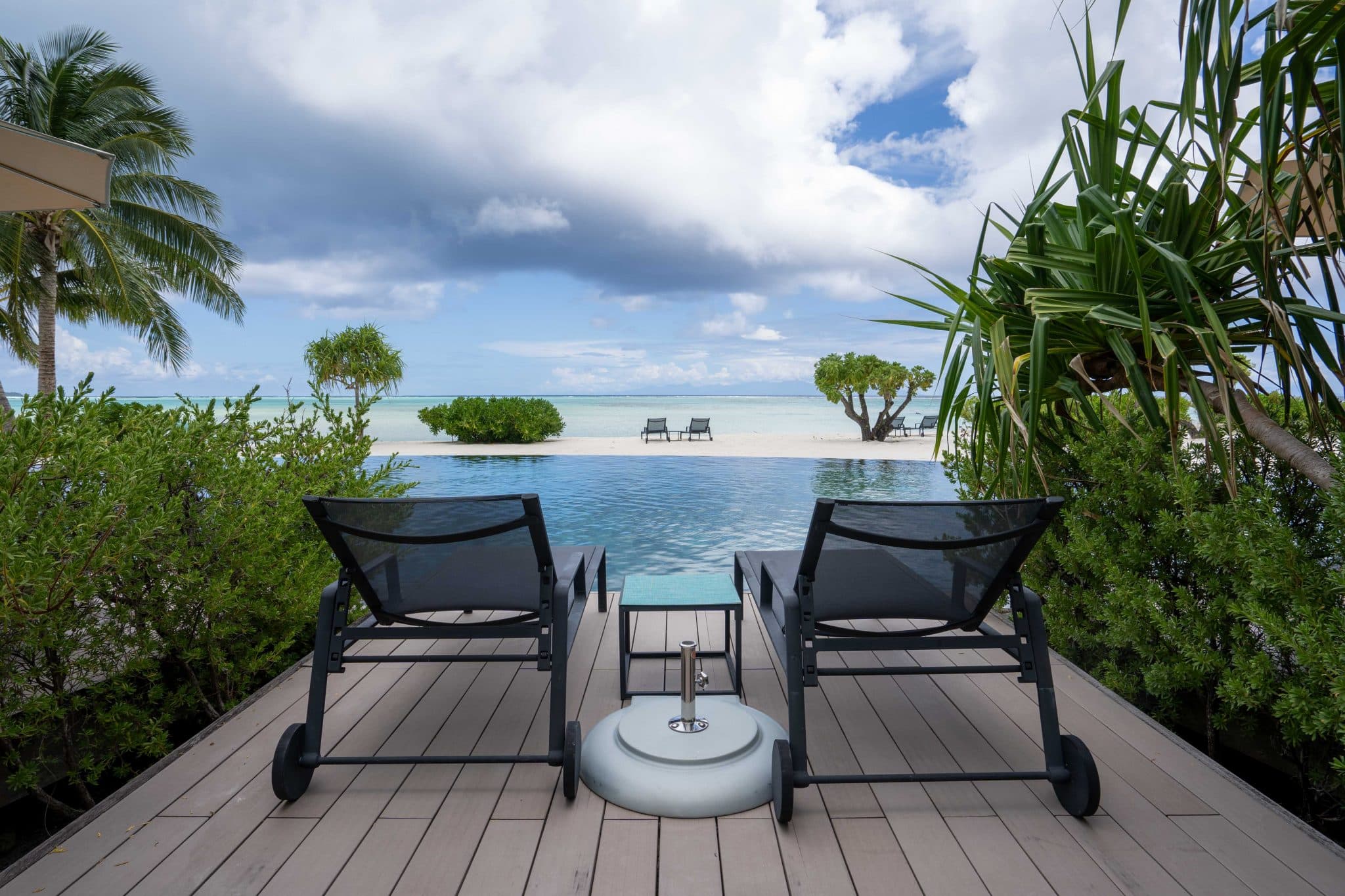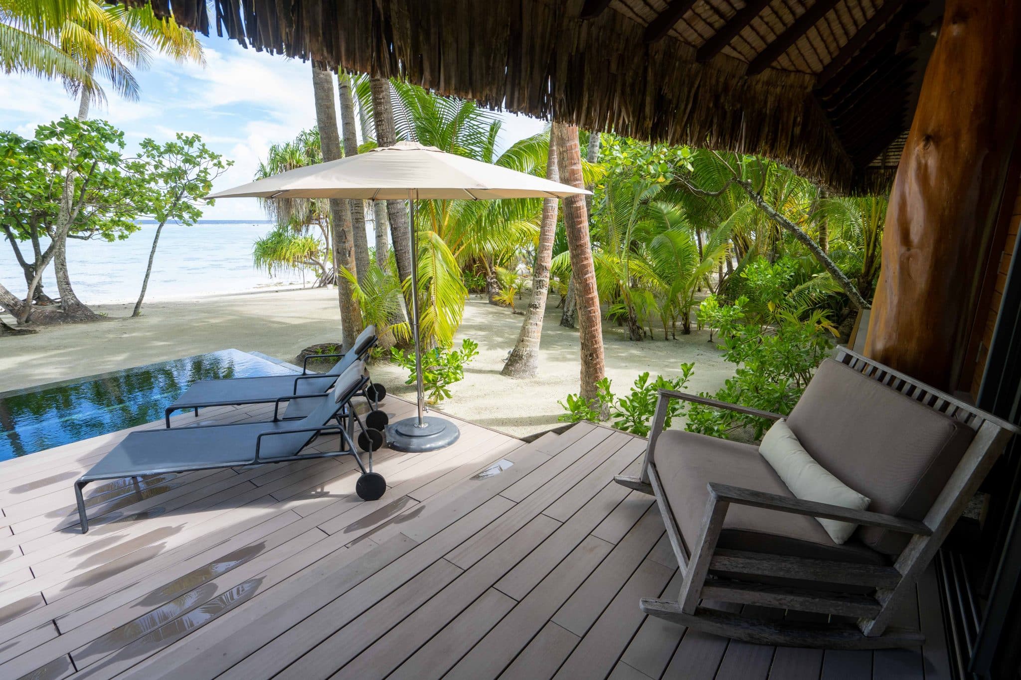 Adding to the outdoor experience, each villa boasts a generous deck adorned with a sheltered dining enclave, ideal for indulging in meals amid the fresh, tropical air. There’s also the private plunge pool, a standout feature complete with inviting recliners and a shielding umbrella, a serene oasis which, coupled with the lapping waves of the beach and the expansive ocean a few graceful steps away, creates an iconic South Pacific abode.