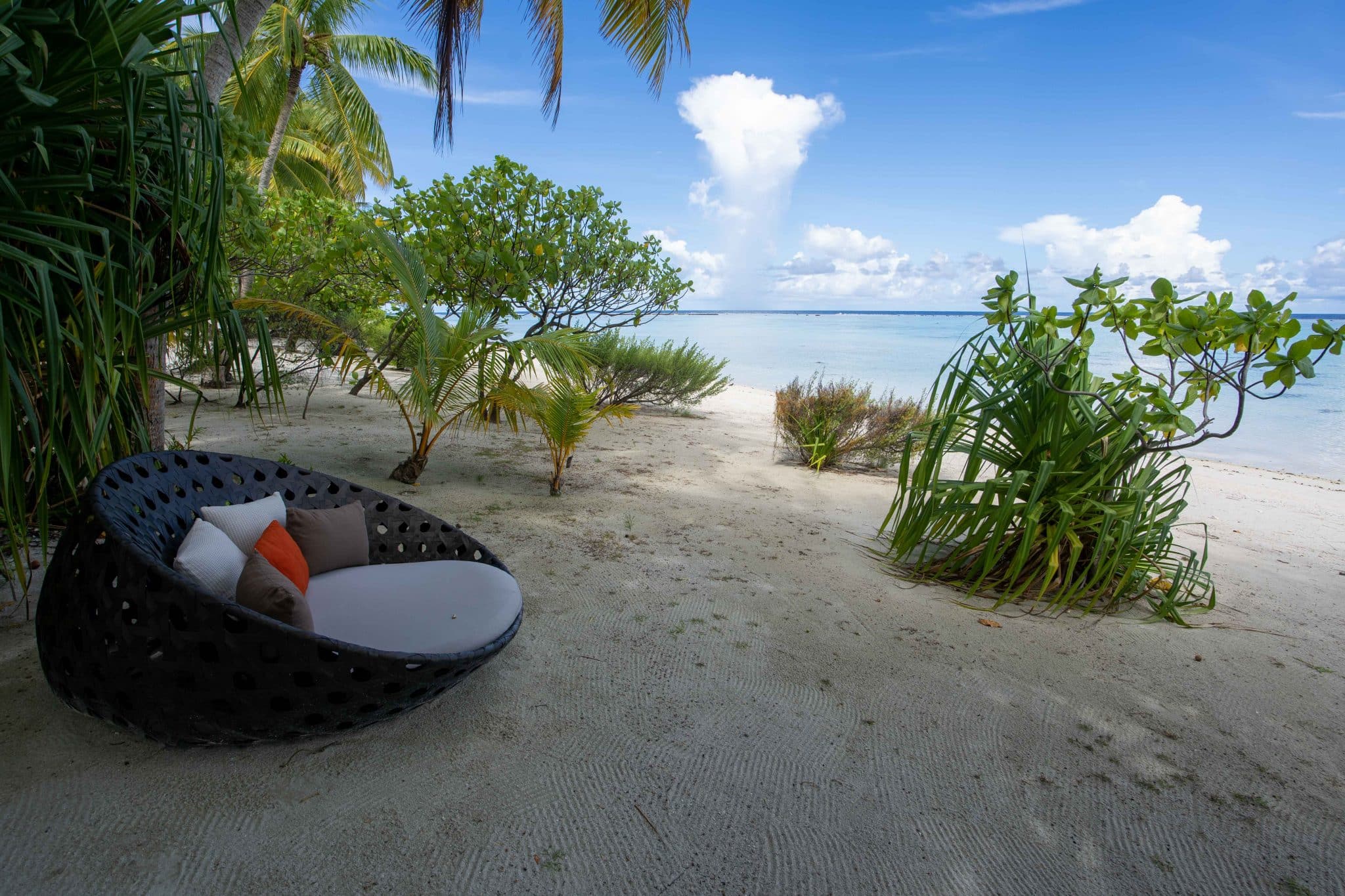 The villas are sprinkled along the eastern and western beachfronts, offering panoramic views of the shimmering ocean waves and beachfront, while the hubs of activity take place at the public areas and shared facilities nestled at the islet’s base. The Resort Centre is the heart of the resort, where you’ll find the front desk, restaurants, beach and pool area, activities, a couple shops, and the bar. If you head a bit more inland, towards the northeast, you’ll discover the spa and fitness facilities, as well as pathways that lead to stunning views and offer convenient access to the airport runway and secluded beaches alike.