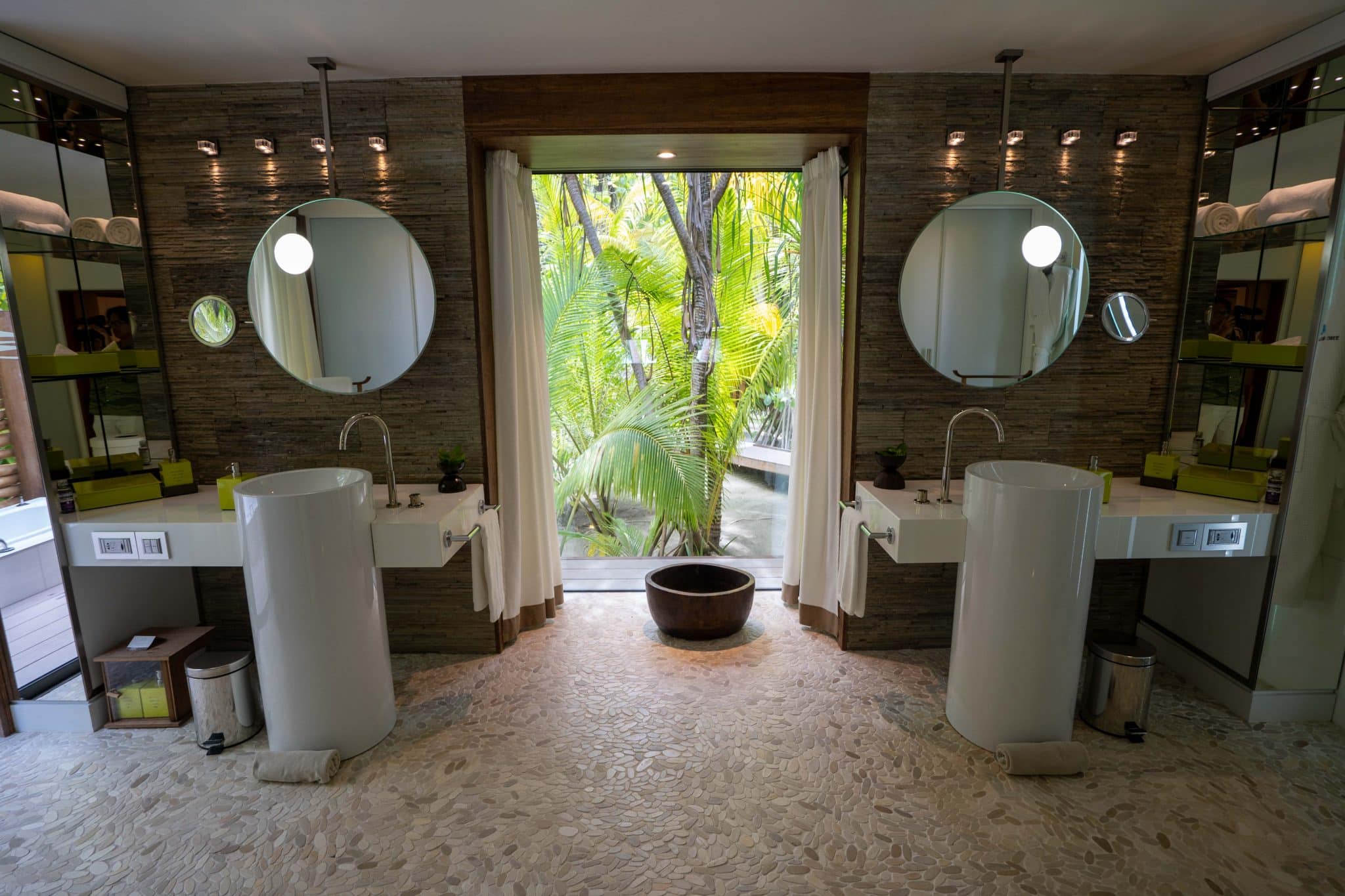 The resort itself unfolds in two distinctive parts: the lower enclave, home to the luxurious resort, and the elevated section, hosting the airstrip and secluded staff village. A winding pathway encircles the main islet, guiding you through the resort’s awe-inspiring grounds, stunning public spaces, and ingeniously concealed villas. For effortless navigation through this slice of heaven, each guest is provided a bicycle; however, for those seeking leisure or simply preferring a laid-back journey, electric carts, steered by staff, stand ready to whisk you to your desired location.