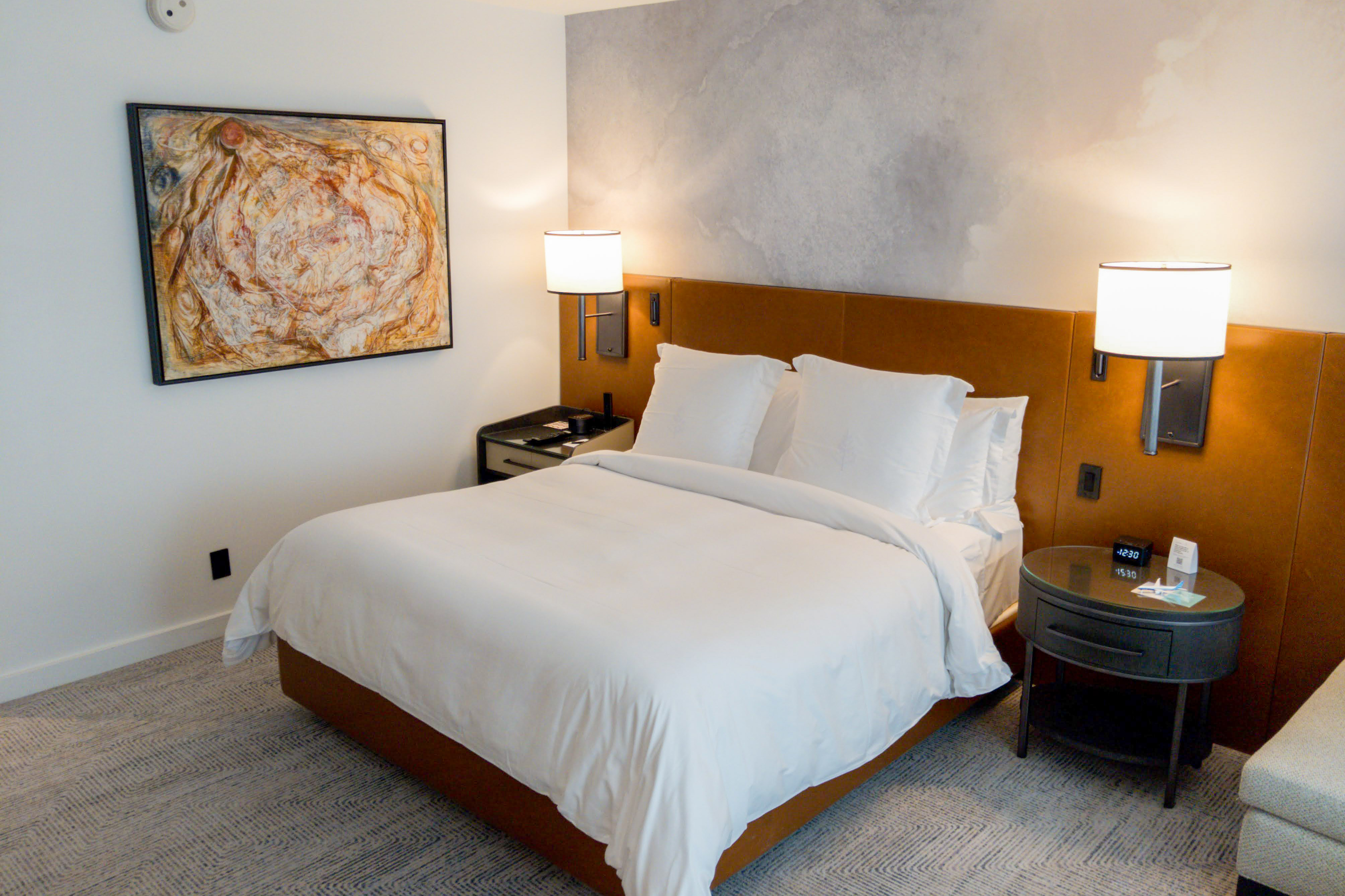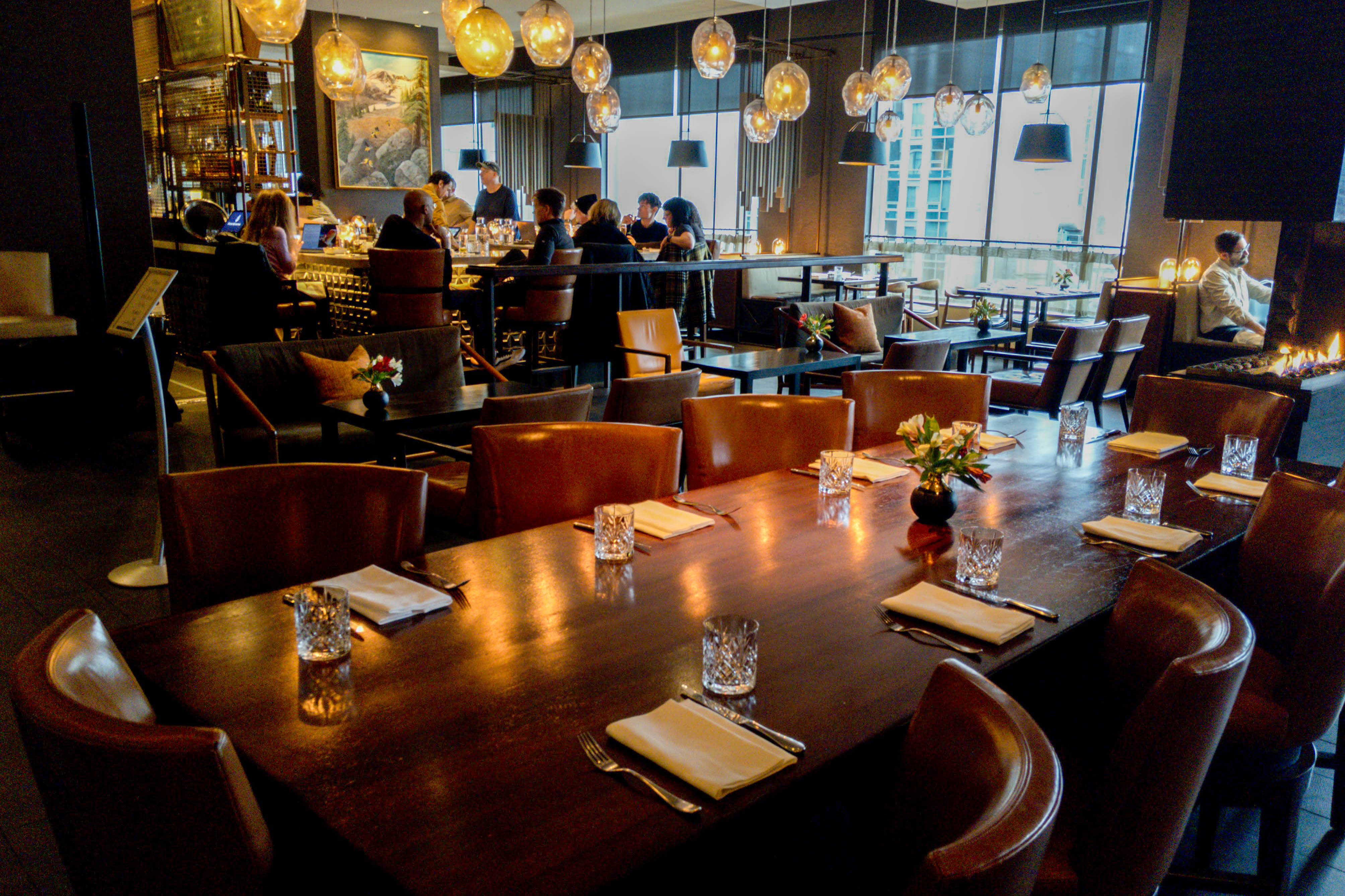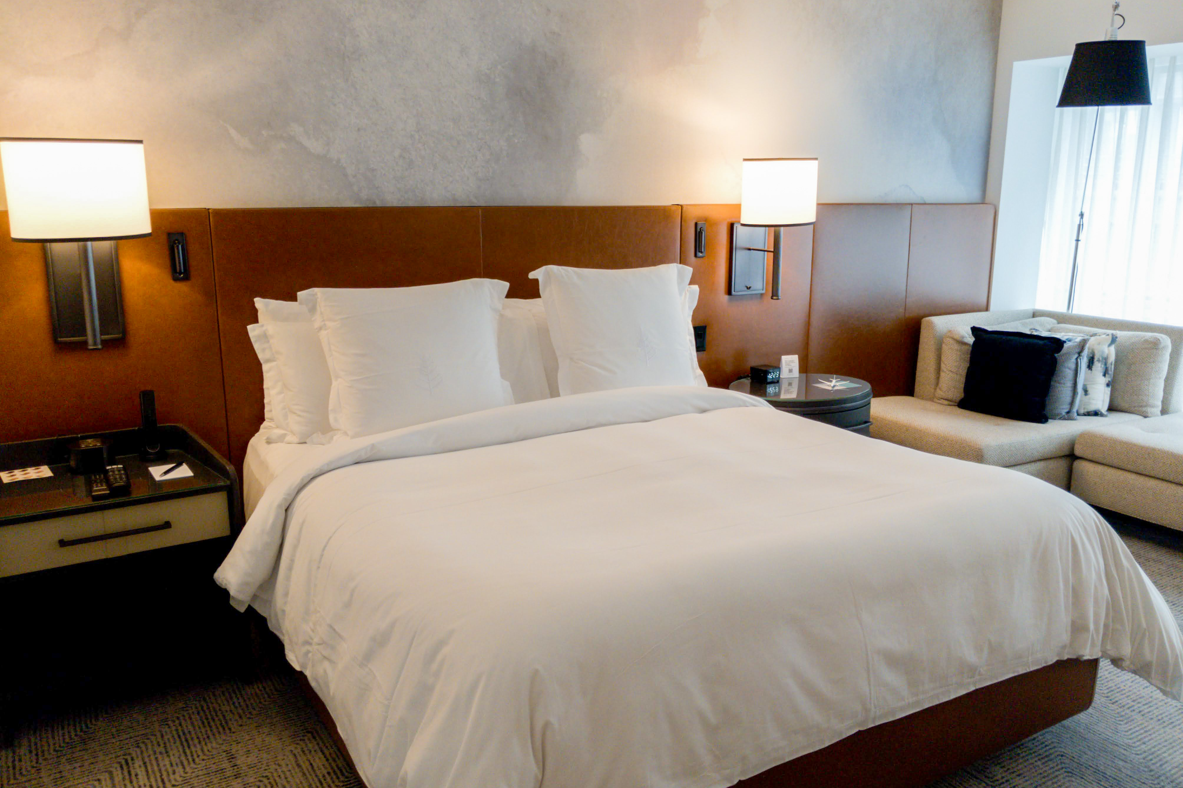 You’ll be welcomed to the hotel by the valet staff, who are also valuable resources for queries about where to go in the city and how to get there. Inside, the lobby lounge emits warmth with its multiple fireplaces, perfect for coming back in from a walk in the drizzle. Natural elements in the seating area and on the walls highlight the hotel’s home in the Pacific Northwest. As you make your way from the check-in area to the elevators, keep an eye out for complimentary baked goods and a warm beverage on offer by the Concierge desk.